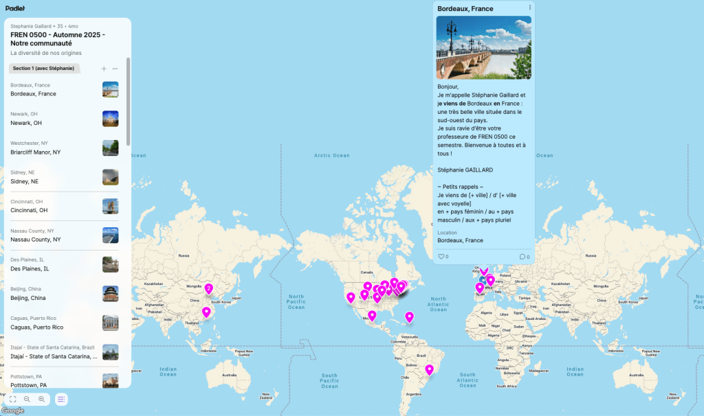 A task to create our French learning community before the first day of class. Students are provided with an example to get inspired from (in the blue vignette) to write their introduction. This Padlet uses the world map feature.